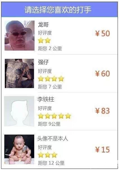 试想一下这样的情景,有天你走在路上看了别人一眼,结果被打了,而你又打不过人家,怎么办?所以未来一定会出现这样一款应用:滴滴打人