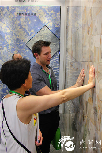 意大利家居设计师在参观55°柔光大理石新品——楼兰木化石系列。他称,自己从小就对中国文化很感兴趣,可这款以西域楼兰文化为灵感创造的瓷砖新品,能给予他更多的创作元素。