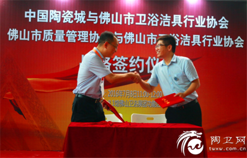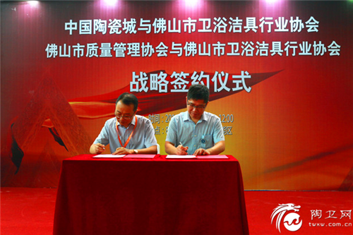 中国陶瓷城营运总经理高原与佛山市卫浴洁具行业协会秘书长刘文贵签约