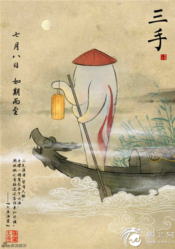 三手,三足渡者,背有天眼,手撑一橹驾龙