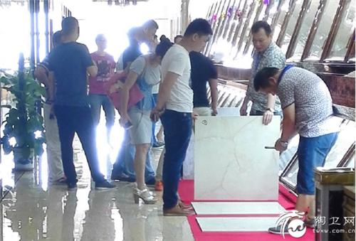 (众多客户前来观看“原石1号”喷墨抛光砖产品)