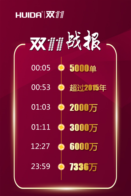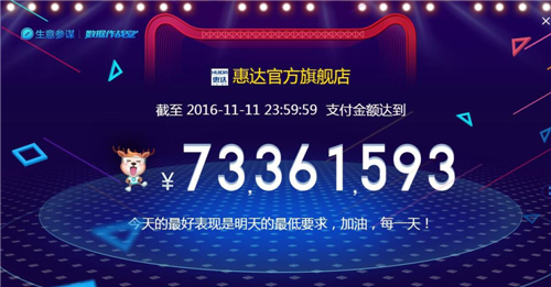 截止11月11日24时,2016年双十一狂欢购物节正式落幕,在这场全民参与,人人剁手的狂欢节日里,惠达卫浴天猫官方旗舰店取得了傲人的销售成绩,单店单日成交额达到7336万,相比去年总销量翻了近十倍,超高的增长率在业内一骑绝尘,创下了又一辉煌纪录。
