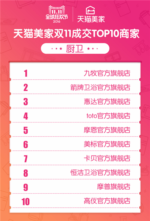 九牧官方旗舰店双11单日成交首次突破2亿,连续7年在卫浴行业登顶,同比去年接近100%增长,其爆款花洒单品热卖近10万件。箭牌卫浴紧随其后,其官方旗舰店成交首次破亿;惠达在2016年双11于智能卫浴和O2O发力,智能马桶爆款单品销售破万台,单品销售额轻松突破3000万;而在智能马桶盖类目,松下、TOTO、科勒继续保持稳定增长,卫洗丽官方旗舰店入驻天猫不到半年,双11销售即告突破1000万,成为厨卫界黑马之一。