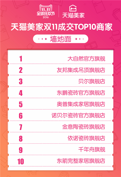 东鹏瓷砖位列瓷砖类第一,本次双11其零售体系内近3000家门店接入到双11万店同庆联合营销活动——“全球双11,BUY家”活动。双11当天东鹏累计成交8500笔全屋瓷砖订单,所有订单全部由东鹏实体门店提供统一的“阳光服务,六次到家”服务。