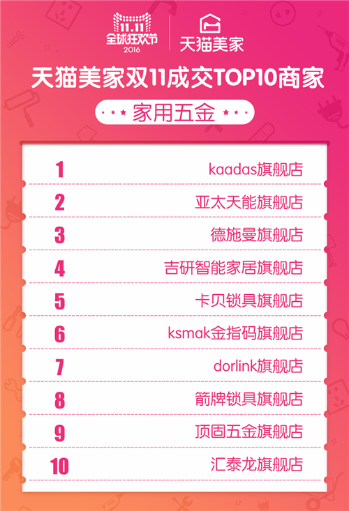 家用五金类目TOP10几乎都被智能门锁品牌霸占,消费升级在这个双11体现得淋漓尽致,且增长势头良好,说明相对传统机械锁,消费者对智能门锁的接受程度越来越高。其中凯迪仕智能锁是去年的类目TOP1,今年继续保持领先,三星智能锁增长势头也很迅猛,开卖10小时便超过了去年双11全天销售。
