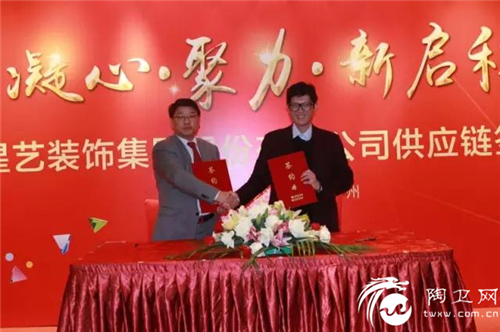 新乐卫浴总经理黎定国与星艺装饰集团总裁余敏签订战略合作协议。