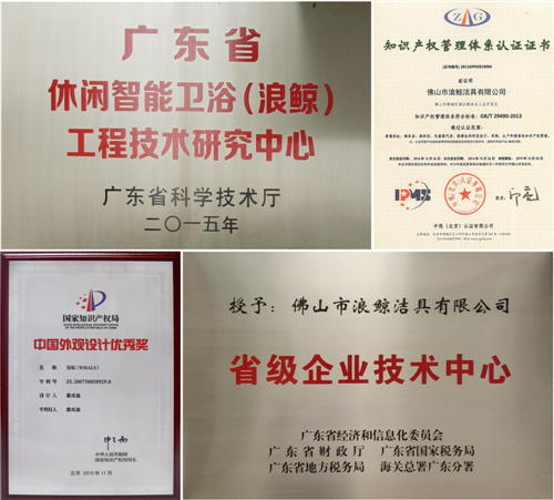 目前,浪鲸卫浴共拥有国际发明专利1项,国家发明专利30项、实用新型专利56项、外观专利424项 。同时,品牌产品玛格丽特系列、鲸鱼缸凭借过硬的技术和出色的设计,获得了「中国专利奖外观设计优秀奖」,同时品牌生产基地也先后获得了「广东省工程技术研究中心」、「广东省企业技术中心」、「国家高新技术企业」、「知识产权贯标企业」等殊荣。