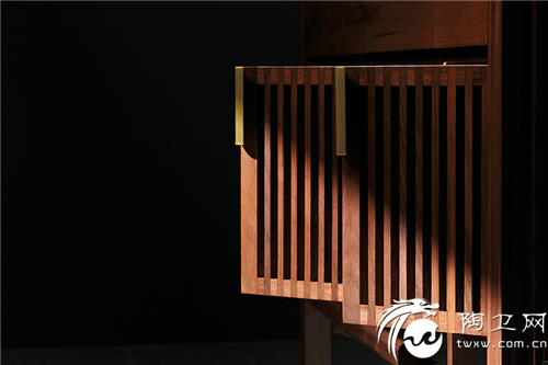 疏影,从结构到装饰都极为简练,轮廓干净利落,功能明确,继承了明式家具的简约形制。在结构设计上,沿用了明式家具的传统,用厚材攒框,四足由横材相连,再用榫卯将轮廓连接在一起。脚的横木,也借签了圈椅书案的处理手法。这种手法,线条简洁明快,更凸显出其黑胡桃的纹理的完整性。造型上的优美给予视觉上的满足和享受,不单调。