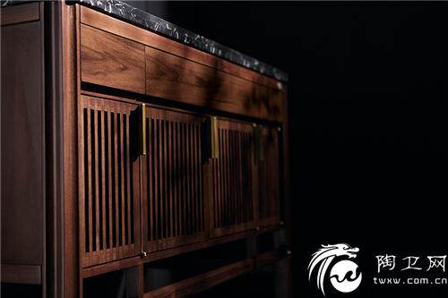 疏影,始终在营造着空间感,初见亦能领略一二。镜子形态仿如古代富人宅园的六角窗棂,在苏州徽州的古建常能看到,感觉熟悉。柜子俨然是一建筑。斜角式大理石水档的设计,隐藏了古建屋顶的含义,柜身结构四平八稳,像建筑的柱梁,竖格的木条与浑厚的横梁原木搭配,构成了一个舒适安静的空间,透光舒朗,协调匀称,空间意境十足。