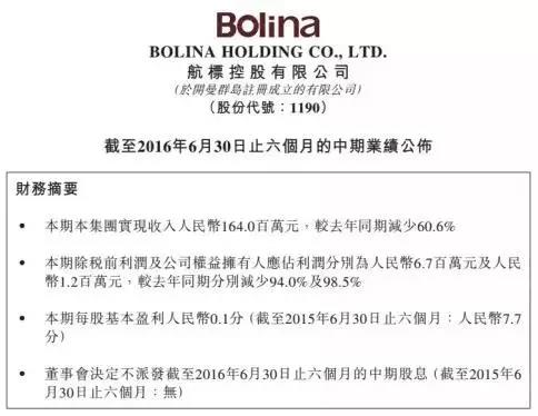 据航标控股2016年半年报显示,截至2016年6月30日止六个月,航标控股的营业收入为人民币 164.0百万元,较去年同期减少 60.6%;归属于母公司股东的净利润为人民币1.2百万元,较去年同期减少98.5%;基本每股收益为人民币0.1分,较去年同期每股收益减少98.7%。董事会决议不派发截至 2016年6月30日止六个月的中期股息。