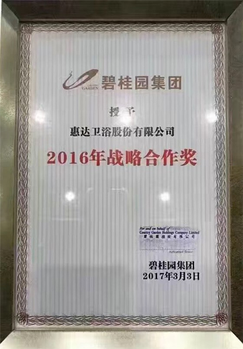 3月3日, 惠达卫浴正式获颁碧桂园“2016战略合作奖”,该奖项是碧桂园集团基于合作伙伴的承接量、履约情况、交付工程质量、集团及区域公司评价等多个维度,综合评选而产生的重量级奖项,是对合作伙伴的一次高度认可。在本次评选中惠达卫浴凭借高品质的产品、先进的研发实力、强大的工程交付能力和专业的服务成功脱颖而出,拿下大奖。