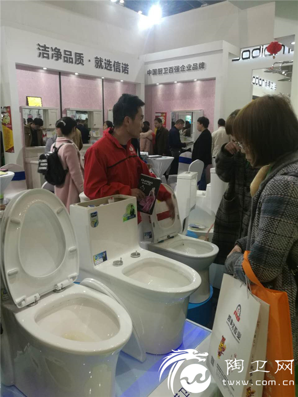 在信诺的展位前,商家将马桶的功能展示放在了入口处,通过冲水测试、功能试验等展示马桶的优越性能,但是更多的经销商似乎已经见惯了这样的吆喝,停留片刻便去下一个展位。