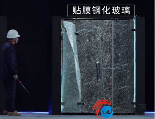 贴膜玻璃在受到破窗锤的击打下,也开始爆裂,由于有膜片粘连,玻璃碎片没有形成飞溅,但由于整张玻璃已处于碎裂状态,仅靠膜片显然无法支撑玻璃重量,很快活动门玻璃带着碎裂玻璃倒了下来,同样充满安全隐患!