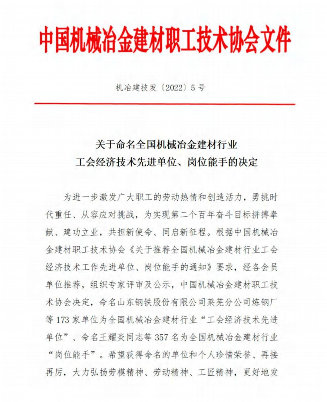 6月16日,中国机械冶金建材职工技术协会发布《关于命名全国机械冶金建材行业工会经济技术工作先进单位、岗位能手的决定》。