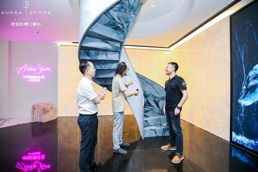 随着热烈的掌声,欧若拉精工奢石总裁丁国兴先生上台为大家讲述欧若拉精工奢石的诞生、由来、目标。颜值上,欧若拉精工奢石可以实现多种表面效果、多种质感表现;工艺上,欧若拉精工奢石耐污、耐冲击、耐磨、防滑、抗菌;定制上,欧若拉精工奢石可厚、可薄、可弯、可透,可应用于墙面、地面、定制、成品等奢石高定系统。丁总表示,希望通过欧若拉精工奢石打造的奢石高定生活空间效果及产品,为全球的合作伙伴们以及广大的设计师朋友打开不一样的思路和风格。欧若拉精工奢石始终坚持以守护自然为使命,致力于运用顶尖科技复刻天然奢石,打造更好的精工奢石品牌高定馆。
