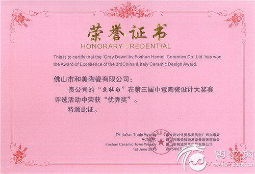 意大利是一个擅长艺术创作和体现的国度,而其时尚界从来不缺乏璀璨斑斓的光彩,每一个巧妙的构思,都是通过惊为天人的设计而实现。本次 “鱼肚白”全抛釉产品荣获第三届中国意大利陶瓷设计大赛“优秀奖”,是各界对和美企业的充分肯定,同时再次力证了和美企业强大的设计力与精湛的技术力。