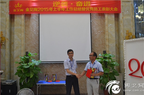 (艾陶制釉总经理刘鸿兴为优秀服务奖获得者颁奖)