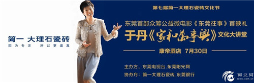 《东莞往事》是一部爱情创业励志之微电影,该剧讲述了一对新莞人情侣,在虎门拼搏、创业、相爱的故事,时间跨度数十年,反映了东莞海纳百川、厚德务实的城市精神,展现了东莞改革开放和产业转型升级的成就。简一大理石瓷砖也将于7月30日在东莞康帝酒店,举办《东莞往事》的首映礼,及邀请《百家讲坛》主讲人、当代知名文化女学者于丹教授开堂授课,为东莞人民寻问家道,畅谈《家和万事兴》。简一旨在通过第七届简一大理石瓷砖文化节系列活动,以光与影的艺术回望东莞的光辉岁月,记录东莞腾飞而起,屹立江头的壮阔画面。同时,也希望让更多的人了解莞城的历史文化、优良传统和家庭情感等人文、家道文化。