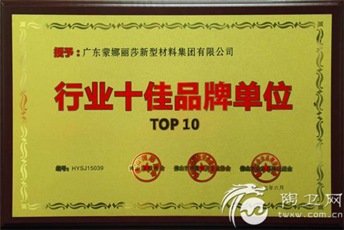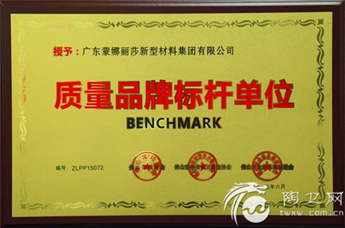2015年6月28日,根据国家工信部、发改委、国家工商行政管理局、国家质量监督检验检疫总局第七部委联合下发的“关于加快我国工业企业品牌建设的指导意见”要求和佛山市工业转型升级的战略部署。对以质量和信誉为核心、产品品牌在行业中处于领先位置的企业,经审核合格,广东蒙娜丽莎新型材料集团有限公司被授予“行业十佳品牌单位”、“质量品牌标杆单位”称号。