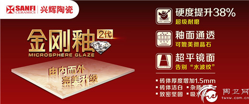 据悉,金刚釉是兴辉今年4月份推出的瓷砖产品。金刚釉,独创“金刚颗粒混合”技术,一举解决了普通抛釉砖不耐磨、硬度低、易刮花的行业问题,并使得新一代抛釉砖产品更富有质感,光泽度更高。金刚釉的问世,在抛釉砖领域具有里程碑的意义。