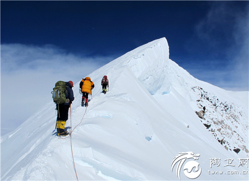 7月10日,华耐登山队从5号营地出发,向顶峰进军。据了解,从海拔5243米的5号营地到6193米的顶峰路线非常陡峭,道路上覆盖了厚厚的冰雪,攀登过程十分艰险。而在距离顶峰约100米的地方,有一段如刀刃般锋利的冰山,队员们必须走在悬空于山体外的雪檐上才能通过,如果此处发生崩塌,将没有生还的可能。在向导的指挥下,华耐登山队最终靠着顽强的毅力登上了顶峰!