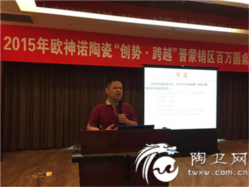 因此,“单店单月如何破百万?”成为各经销商关注的焦点。就此,7月26日,欧神诺陶瓷北方大区经理黄浪平、晋蒙销区经理严明田,组织了30多名经销商及操盘手齐聚朔州召开以“创新·求变·进取”为主题的会议。这是一次智慧与文化并存的交流分享会议,摒弃了以往的官方报告形式,引入国际先进的“百万圆桌会议”之构想,并巧妙地融入了PK机制。“百万圆桌会议”旨在探索单店月销售如何过百万,致力于提升各经销商四大核心版块(团队打造、店面管理、渠道开拓、行销活动)高标准的运作水平,树立欧神诺品牌在区域内的高端形象及行业影响力。站在年中的节点上,严明田率先总结了晋蒙销区上半年整体工作成果,逐一指出各个网点的不足,提出了完善、可行的改良优化方案以及建议,并依照公司发展策略规划对销区下半年工作进行了具体的部署。不同的经销商,不同的阶段,难免会在不同的方面遇到不同程度的困境。不过,这四个板块是经销商们经常面对的、也最为关注的课题。在本次会议中,那些来自不同市场,拥有丰富的接地气实践经验的老板,通过讨论PK、分组问答、总结考核等环节,畅所欲言,博采众长,取得了良好的效果。“店面升级与管理是发展的基础,渠道建设是发展的核心,只有各位经销商老板做好四大运营版块的工作,欧神诺单店销售势必过百万!”。黄浪平作总结性发表,他以“创新·求变·进取”为主题,通过相关数据分析、市场变化分析、行业大势的精准论证、大营销计划的落地实施计划、下半年保持稳定增长的核心策略规划的精彩阐述,不仅为经销商们指明了发展的方向,更注入了一剂强心剂,各位经销商老板信心倍增,随即当众承诺下半年目标任务完成计划,以势不可挡的态势将会议推向最高潮!