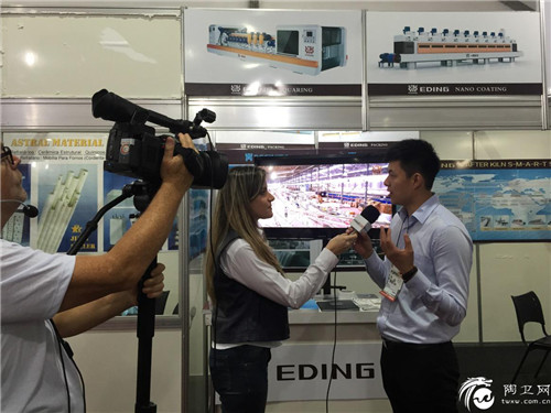 这次出击,我司向巴西推送窑后系列产品,譬如畅销海内外的明星产品:陶瓷墙地砖抛光生产线,陶瓷砖干式磨边生产线,纳米抗污生产线等;更隆重介绍了全球首创的新品——反置式抛光生产线。展会期间,巴西陶瓷协会会长到访一鼎摊位,而巴西电视台更是专门采访我司海外部经理,了解本次一鼎科技参展的情况。