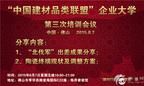 2015年8月7日(星期五)晚上7点,“中国建材品类联盟”企业大学培训会议在瓷海国际C座22饰界奢瓷馆顺利举办;联盟会议定在每个月的第一个星期五,现已是第三次“联盟”培训。
