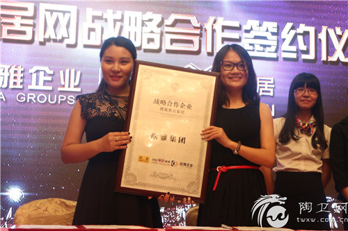 欧雅陶瓷企业代表霍洁玲与搜狐焦点家居网代表蒋晓霞进行合作签约仪式