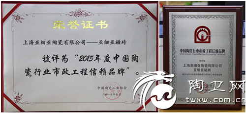 2015年10月18日,第26届佛山陶博会开幕当天,亚细亚以一如既往的高端形象,在2015年度中国优秀陶瓷经销商颁奖典礼上,狂揽“市政工程信赖品牌”和“金牌陶瓷经销商”等7项大奖,成为陶博会开幕当天的一大亮点。