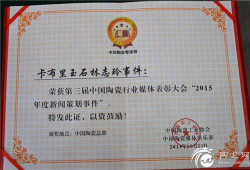 2015年10月21日,在陶瓷行业盛事——秋季陶博会期间,由中国陶瓷工业协会、中国陶瓷媒体俱乐部主办的,中国陶瓷行业优秀媒体及优秀新闻作品颁奖大会盛大举行。卡布里·玉石瓷砖“4月18日林志玲助阵卡布里开业盛典”得到“中国陶瓷行业2015年度十大新闻策划事件”荣誉。