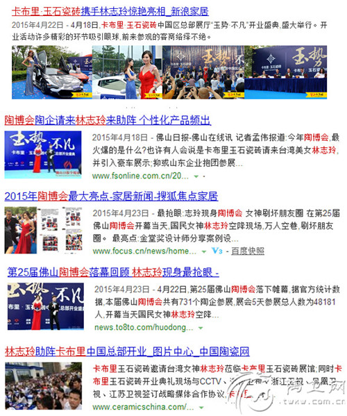 林志玲助阵卡布里开业盛典是品牌开业与明星活动营销十分有效的结合,活动得到传媒和行业的大规模的传播,成为行业的头条新闻。万众瞩目的国民女神林志玲的出场,引起了来自数千名粉丝的热烈欢迎,当天,卡布里七星级玉石公馆成为该届陶博会中人流量非常旺的展厅。红遍陶瓷人微信朋友圈的媒体报道,无一没有林志玲在卡布里开业盛典的惊艳亮相。