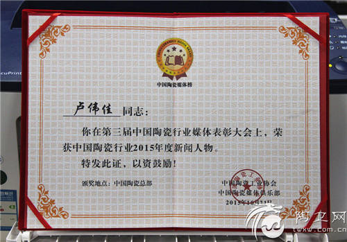 不过,本届大会的最高潮部分还是压轴的媒体表彰大会,在表彰环节,亚细亚集团总裁卢伟佳被评为中国陶瓷行业2015年度新闻人物,评选标准有三项:企业发展势头迅猛、企业家无负面新闻、三家以上媒体主编推荐。据介绍,这是本次表彰大会最高规格的奖项。