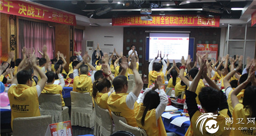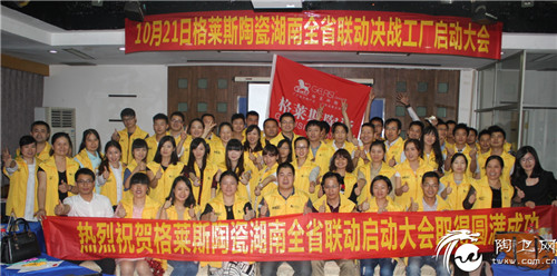 10月21日下午,来自长沙、株洲、湘潭等地的格莱斯销售精英们身披黄色“战衣”,个个精神抖擞。两点整,启动会正式开始,由格莱斯陶瓷销售经理李红生首先上台作动员。随后,本次活动的经销商代表长沙豪联建材董事长张翠屏致辞。张总在致辞中的一句“希望精英们全力以赴,为2015年的营销工作画出最靓丽的一笔!”博得了大家的喝彩;她还拿出一千元作为启动会的奖金,台下顿时响起热烈的掌声。