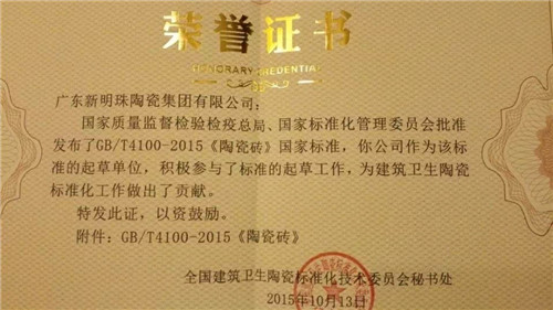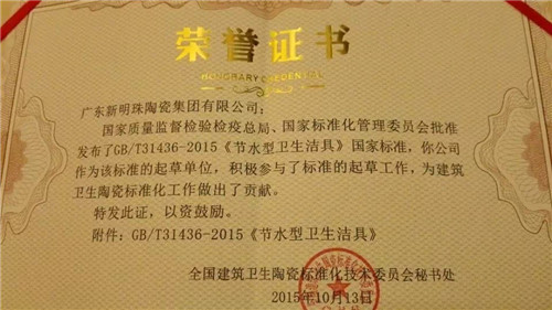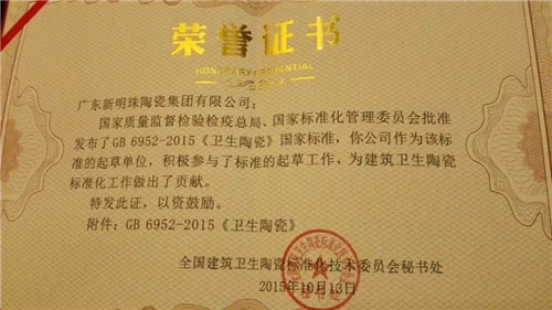 会上,全国建筑卫生陶瓷标准化技术委员会秘书处给新明珠陶瓷集团积极参与起草三项国家标准给予表彰,作为标准的起草单位,新明珠集团积极参与了标准的起草工作,先后参加了了GB 6952-2015《卫生陶瓷》国家标准和GB/T31436-2015《节水型卫生洁具》国家标准及GB/T4100-2015《陶瓷砖》国家标准,为建筑卫生陶瓷标准化工作做出了贡献。