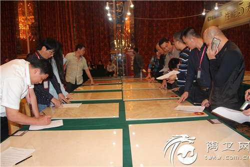 最后,恒福陶瓷答谢晚宴在宴会厅拉开序幕,恒福陶瓷市场部经理邹赤峰表示经销商们积极参与新品订货,新品订货量“战绩显赫”。恒福陶瓷新品瓷砖发布会也达到了当晚的高潮。恒福陶瓷众多经销商表示对新品极致大理石的市场前景一致看好,并相信极致大理石将会在终端取得良好的销售业绩。