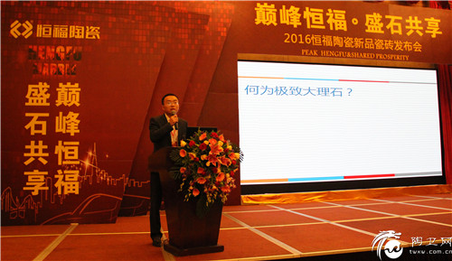 在会议上,恒福陶瓷市场部经理邹赤峰从营销战略、推广策略、产品优势、终端展示方面做了极致大理石的上市解析。邹经理指出作为恒福陶瓷倾心打造的石中贵族——极致大理石,打造了贵族气质的高品位生活体验的精神内涵,以全新的姿态,满足高端消费者的诉求。
