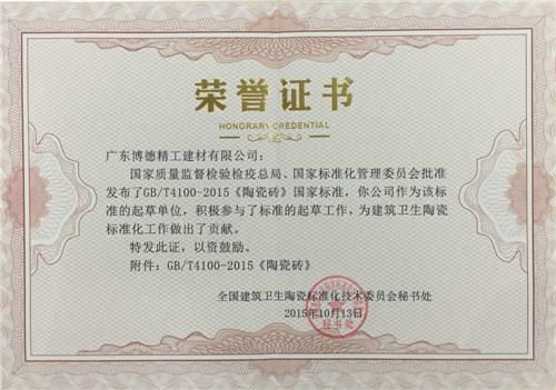 2015年12月1日,由咸阳陶瓷研究设计院负责起草,广东博德精工建材有限公司等国内建陶行业龙头单位参加起草的《陶瓷砖》新国家标准(GB/T 4100-2015)正式实施。