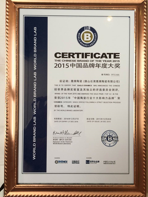 本次颁奖,鹰牌陶瓷与中国国航、北汽集团、华为技术、海尔、苏宁等35个活跃2015年度中国经济舞台的领军品牌当选为“中国品牌年度大奖”,这是世界品牌权威机构和广大消费者对鹰牌陶瓷再一次的高度认可,再度助力鹰牌陶瓷创赢下一个40年辉煌。