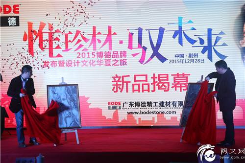 盛会以荆州博德黄董事长黄总与博德精工石材事业部副总经理戚晓平共同新品揭幕正式拉开序幕:博德公司2015年的巅峰之作——霸王玉,扛鼎之作——精工瓷石,创新之作——精工石材正式于荆州面世,博德公司产品部产品设计主管张春艳对博德霸王玉、精工瓷石进行全面的诠释,从技术、设备、选料制造到产品的风格搭配、设计理念等讲述了产品和美学,引人入胜,吸引了众多的关注目光。
