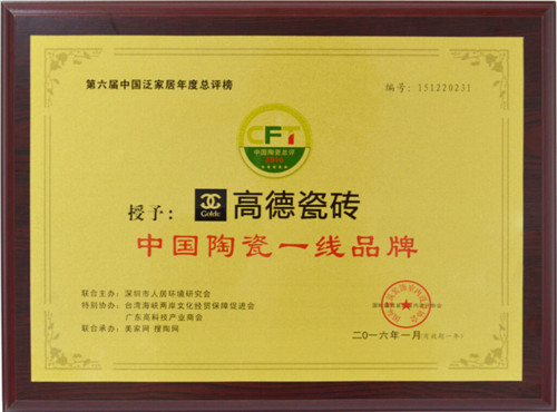 2016年1月7日,“第六届中国泛家居年度总评榜”在佛山绿岛湖国际会议中心盛大举行,作为陶瓷行业一年一度的行业盛典,泛家居年度总评榜的获奖企业备受关注,其中,高德瓷砖不负所望,一举夺得“中国陶瓷一线品牌”大奖。