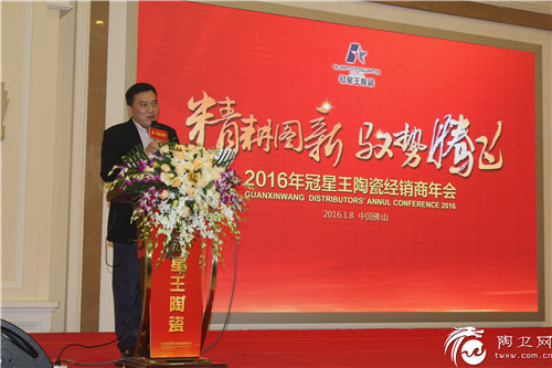 冠星王陶瓷销售总经理王金堂在年会上从产品结构与定位、营销模式、团队建立与管理、产品优惠政策等方面进行了多层次的实践指点。王总表示,2016年,冠星王推出了一系列与国际潮流接轨的新品,大理石类新品更是无论技术还是设计都走在国际的前沿,性价比之高行业难得一见,而在营销方面,王总呼吁经销商朋友要多举办促销活动,厂家方面也将推出大量的政策在这方面对经销商朋友进行扶持。