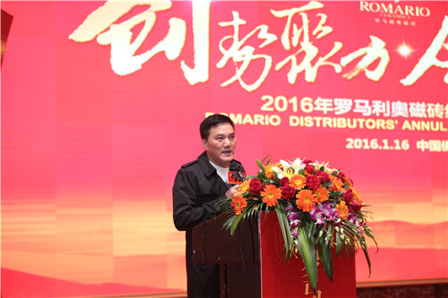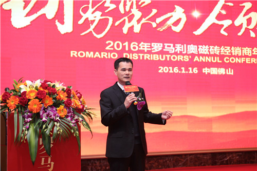 罗马利奥磁砖国内销售总经理吴里生在会上作了主题为《同心聚力 深耕渠道》的发言。吴总回顾了罗马利奥磁砖2015年的销售业绩、终端专卖店的展示弊端,并对2016年的销售计划做了总体性的规划。吴总表示,2016年,尽管大环境不是很明朗,但我们充满信心。罗马利奥磁砖将借助新工厂新引擎,携手全国经销商朋友共同破浪前行,互利共赢,全力推动罗马利奥磁砖由行业知名品牌向大众知名品牌迈进!