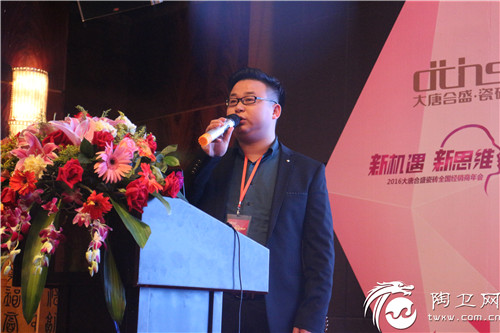陶卫网讯 记者/马静玉 优化渠道,转变增长方式,实现新型盈利模式。1月17日-18日,2016年大唐合盛·瓷砖全国经销商年会在佛山市财神酒店举行。本次活动以“新机遇,新思维,新发展”为主题。大唐合盛·瓷砖董事长兼总经理曾志坚,董事&艺术总监刘小玮,副总经理兼营销中心总经理邱隆煌,品牌市场中心总经理符竣雄等公司高层领导,以及200多位来自全国各地的大唐合盛经销商出席了活动。