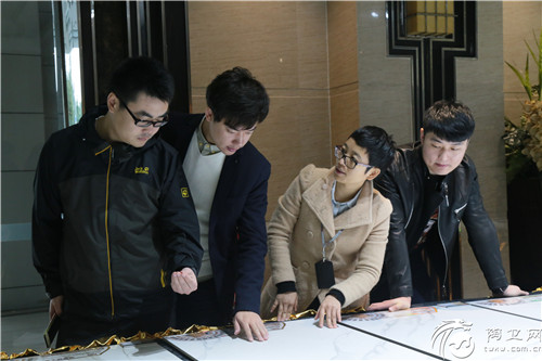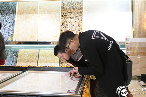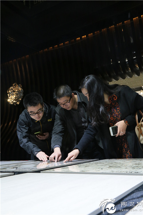 在精工玉石选材区,堂皇亮丽的选材区吸引设计师们眼球,设计师细细观看纹理精雕细琢、画质高清、花色高贵迷人的精工玉石,听着姚经理对产品鉴赏以及高深工艺之阐述,无不发出“仅此一家”的感叹!设计部陈总则跟大家介绍配套中的重头戏——精工玉石金属背景墙,设计师均对多款造型精美的背景墙表现出浓厚的兴趣,向陈总询问产品的材质与应用,对产品仔细鉴赏。