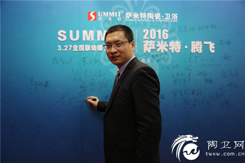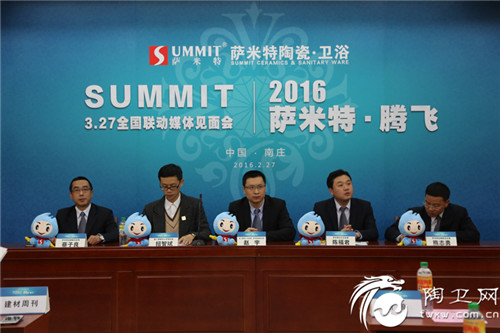 2016年2月27日,“2016萨米特.腾飞——SUMMIT 3.27全国联动媒体见面会,在萨米特党建会议室正式举行。萨米特陶瓷品牌总经理赵宇、萨米特雅光砖总经理陈福君、萨米特卫浴总经理沈丽华、新明珠集团第二营销中心市场总监招智斌等领导与20余家主流媒体代表出席见面会,共同见证了萨米特品牌2016年发展战略布局及萨米特开年大作——“3.27全国开仓·S行动”全国联动大型明星促销活动的开展。