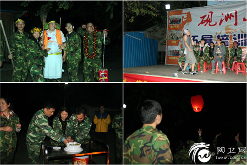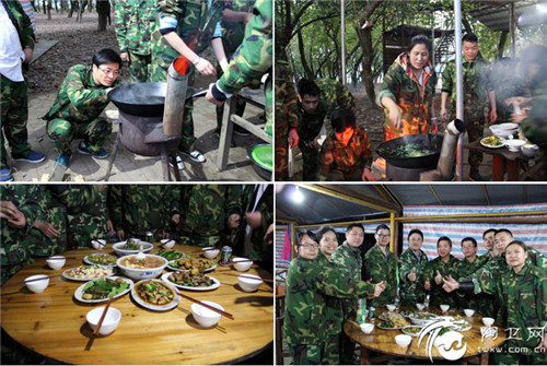 自己动手,丰衣足食。第二天晚上的野炊活动,队员们瞬间战士变大厨,洗菜、切菜、炒菜细化分工后紧密合作,八仙过海,各显神通。酒饱饭足后的队员们又为篝火晚会紧急彩排,三打白骨精、个性时装秀、自编小品舞蹈等,赢得了教官和队员们的阵阵掌声。在教官和公司领导的安排下,大家一起为过生日的队员们举办了别样的生日宴。晚会最后,每个小队都放飞了写有祝福语的孔明灯,并燃起了烟花,预祝2016金艾陶瓷砖品牌业绩蒸蒸日上。