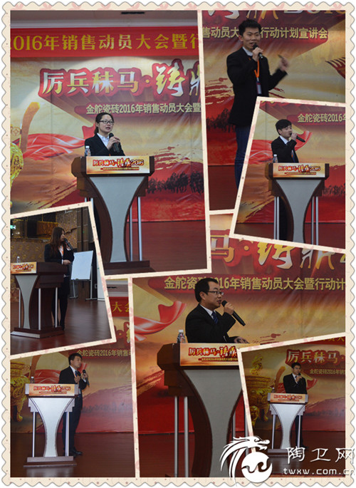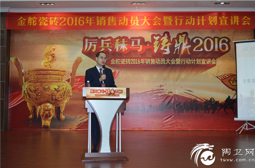 大会伊始,金舵瓷砖总经理李丹锋作开篇致辞,他表示2016年是金舵品牌三年规划的开始之年,希望每一位金舵战士的2016年行动计划都能在终端得以落实,并切实服务终端,为客户提供最有价值的服务。同时,李总号召全体金舵将士奔赴全国各地,宣讲公司的战略规划,销售人员落实每个区域的行动计划。他指出,无论是销售人员、推广人员、策划人员还是设计人员,只要有了明确的目标和方向,并能够付诸行动,就能在各自的岗位发挥所长,创造价值。