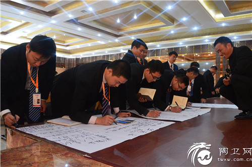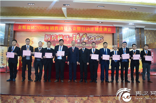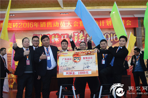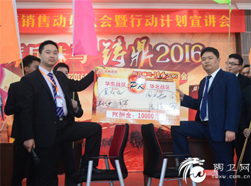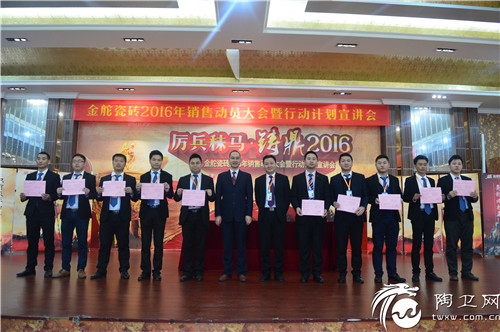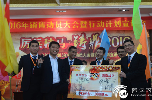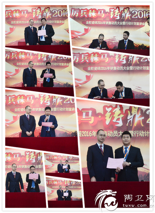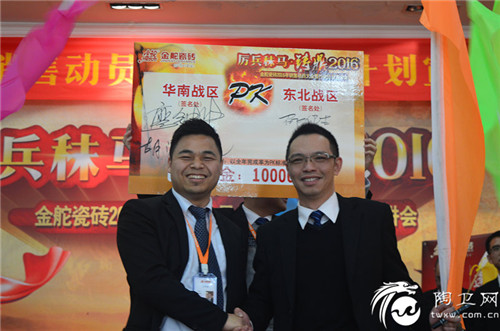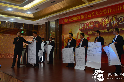下午,振奋人心的签署军令状环节和PK环节如期而至。金舵品牌销售人员如同即将上战场杀敌的战士,摩拳擦掌、横刀立马,销售一部总监颜利俭和销售二部总监郑文斌分别带领各自的队伍陆续登场,金舵瓷砖总经理李丹锋亲自签署并颁发军令状。收到军令状的销区战士个个心跳加速、热血沸腾,他们用最洪亮的声音宣读军令状,薄薄的军令状对于他们来说不只是一份沉甸甸的责任和承诺,更是一份销售人员的尊严,一份战士不达目的不罢休的誓词。总计接近100万的对赌奖金,PK奖金就是那丰盛的封赏,我们坚信,金舵人拥有周密的战略战术的部署、齐整的兵马粮草和一群久经沙场的战士,我们一定能够攻无不克战无不胜。我们期待,在2017年年初的某一天,待到将士凯旋时,共饮庆功酒。