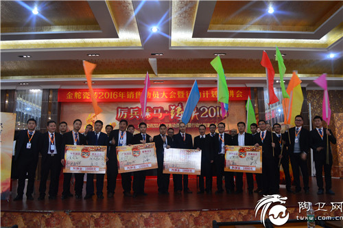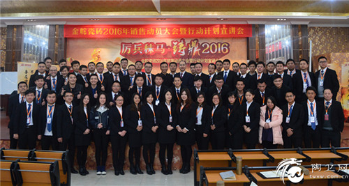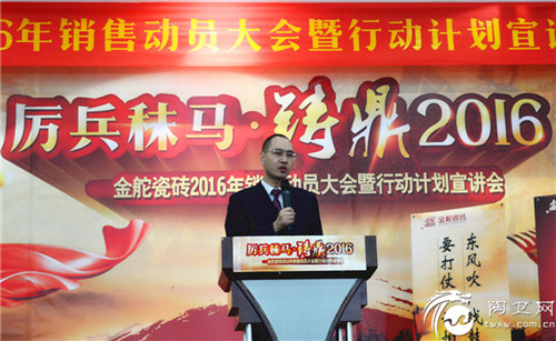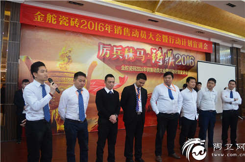 PK环节后,李总发表了慷慨激扬的出征词,他指出:“此次动员会相当于中共的十八届三中全会,是一个全新的起点,也宣布了金舵进入了一个新的纪元。2016年是金舵三年规划的开局之年,这一年我们的营销策略为:1、职业化:打造各部门分工明确、职责清晰的管理机制,各项工作规范化、流程化、制度化、标准化;2、全员营销:打造全员营销的组织架构及评价体系。3、贴近终端:建立以推广部为先锋的厂家服务体系。4、产品市场化:打造面向市场需求的产品研发体系。我们的目标是将金舵打造成一个百年品牌,并且让每位金舵人的生活、事业向好的方面发生重要改变。因此,在座的各位都要积极快速的将公司的思想、方针、战略传递到终端网点,传递给全国各地的每一位金舵家人。2016年,金舵将掀起轰轰烈烈的终端营销变革,主要表现在:1、开拓至少100个以上营销网点,举办至少1000场以上终端促销爆破活动;2、在发展中解决问题,调整和优化现有产品展示方式和营销网络;3、解决终端店面脏乱差的形象,打造简约、时尚的,更适应潮流的店面形象;4、将建立全国金舵家人统一微信、YY及网络沟通平台、通过“六纬一体”深入终端,真正实现厂商无缝对接。”最后,李总提出号召,他说到:“改革是艰难的,只要大家上下同欲、万众一心、形成合力,就一定能够达成我们想要的目标。”